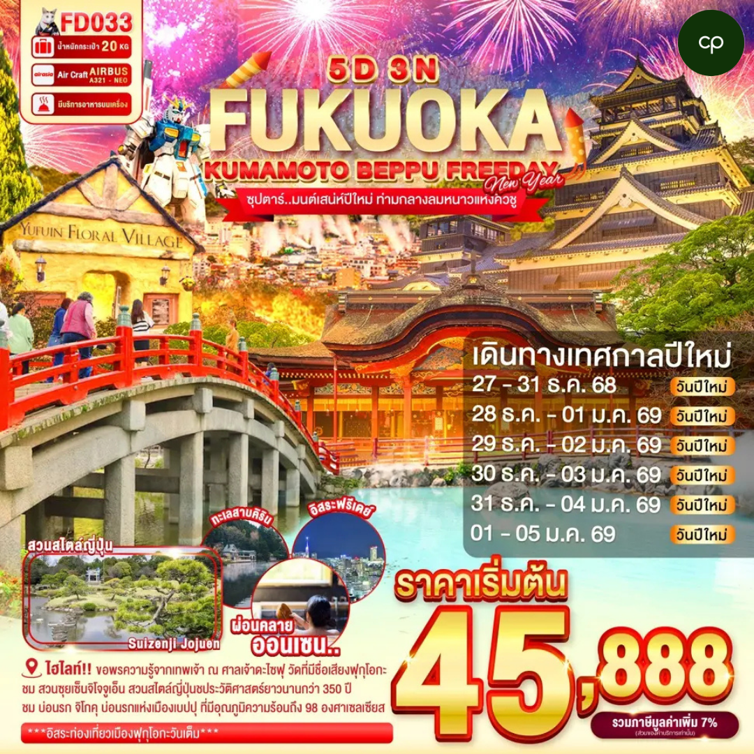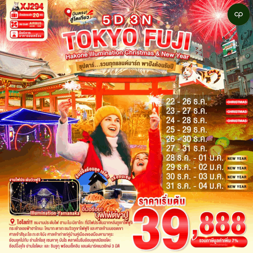 ชมงานประดับไฟฮานะโนะมิยาโกะ ศิลปะกลางแจ้ง ที่จัดแสดงลงานศิลปะที่มีไฟประดับทั่วทั้งบริเวณสวนกว่า 5 แสนดวงพร้อมฉากหลังภูเขาฟูจิ วืวภูเขาไฟฟูจิสีขาวตัดกับพื้นหลังสีฟ้าที่หมู่บ้านโอชิโนะฮักไก นั่งกระเช้าลอยฟ้าฮาโกเนะ โคมากะตาเกะ พาคุณขึ้นไปยังยอดเขาที่สูงที่สุดเพื่อชมวิวภูเขาไฟฟูจิ พร้อมเรียนพิธีชงชาญี่ปุ่น ดั้งเดิม แวะสักการะสิ่งศักดิ์สิทธิ์ ณ วัดอาซากุสะ พร้อมแวะชิมของอร่อยที่ ถนนนากามิเสะ และย่านโทโนสุ เซนคาคุ บันไร ช้อปปิ้งย่านโอไดบะ และ ชินจูกุ